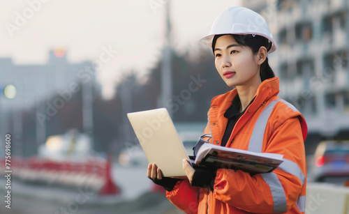 Asian female engineer with short black hair, at a road construction site,generative ai