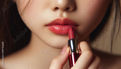 Asian Female Model putting on Lipstick - Cosmetic Advertisement of Lip Gloss, Liner, Lipstick, Lip Balm, - Woman Posing with and Applying Lipstick - Gloseup of Beauty Product