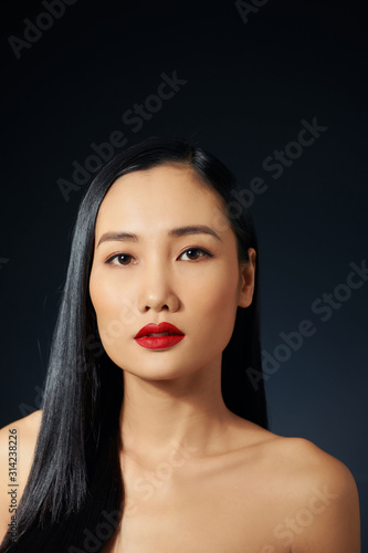 Asian female model with red make up against black background.