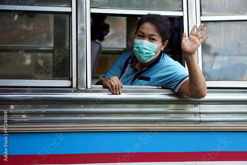 Asian female passenger wear hygienic face mask, sit alone on the bus. Concept :Protecting self in using public transport during the Coronavirus or Covid-19 epidemic. Keep social distancing. New normal