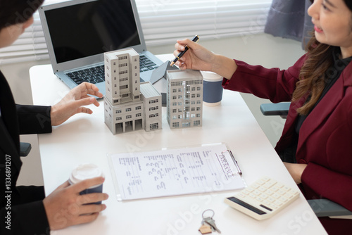 Asian female real estate agent presents a house. A confident and friendly real estate agent presents a small model home to a large client.