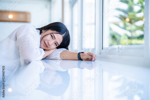 asian freelance people business female wearing smartwatch fell relax using after working with laptop computer for browsing internet, chatting and blogging and smartphone,notebook in coffee shop.