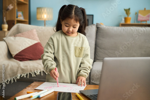 Asian girl sitting in living room drawing with pink marker while laptop rests on table, cozy couch with pillows and lit lamp in background