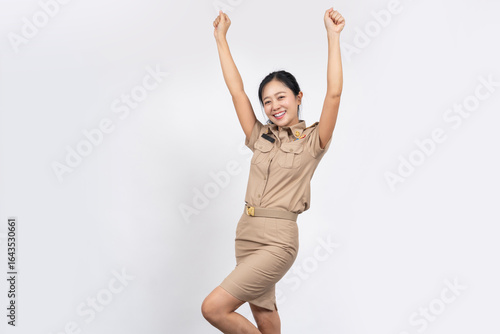 Asian girl wearing brown Thai government uniform raising her hands and arms up with happiness isolated on green background. Excited woman success concept.