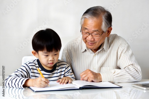Asian Grandpa and Grandchild Doing Homework Together