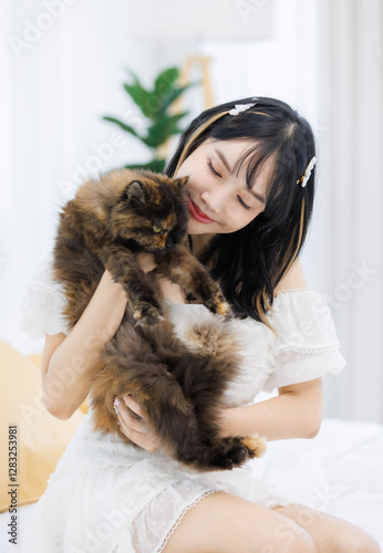Asian happy young female sitting on white bed owner smiling hugging playing fluffy tortoiseshell cute little kitten breed pussycat pet friend in bedroom at home, Concept love animal comfort rest care.