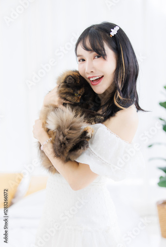 Asian happy young female standing smile look at camera holding playing fluffy tortoiseshell cute little kitten breed pussycat pet friend in white room at home, Concept love animal comfort rest care.