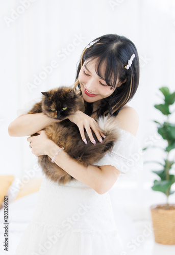 Asian happy young female standing smile look at her cat holding playing fluffy tortoiseshell cute little kitten breed pussycat pet friend in white room at home, Concept love animal comfort rest care.