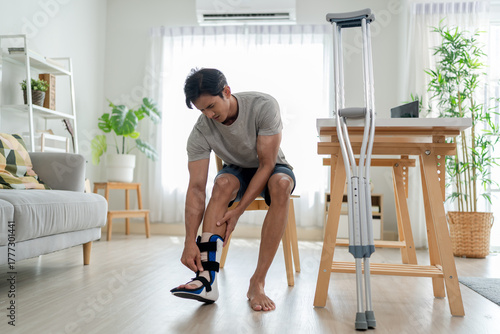Asian injured man wearing leg splint and walking with crutches.
