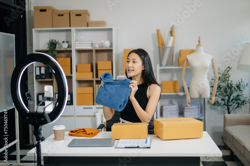 Asian lady blogger showing clothes in front of the camera to recording vlog video live streaming at her shop.