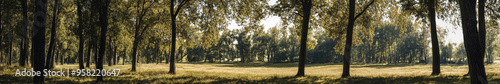 Asian landscape, tall ancient trees, broad canopies, clear blue sky, soft white clouds, no orange sunlight, neutral daylight, peaceful, harmonious, serene, nature, open land, no buildings