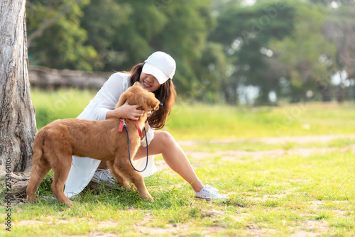 Asian lifestyle woman playing with golden retriever friendship dog so happy and relax near the road in sunrise outdoor the summer park.