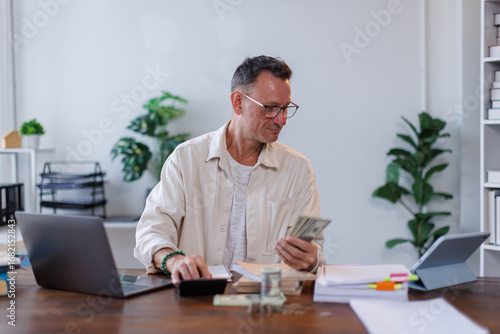 Asian male accountant or banker making money calculations. business man in workplace, Documents, tax, report for analysis Savings, finances and economy concept.