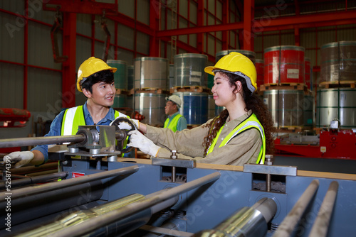 Asian male and female engineers team Control, check, maintenance of machinery. sheet metal fabrication