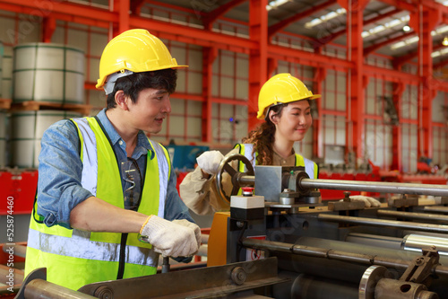 Asian male and female engineers team Control, check, maintenance of machinery. sheet metal fabrication