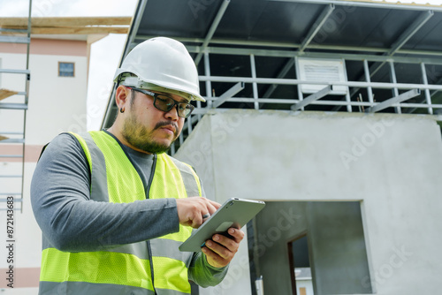 Asian male engineer in white hard hat and reflective vest using tablet at construction site. Focused on project details. Partially constructed building in background. Professional and engaged.