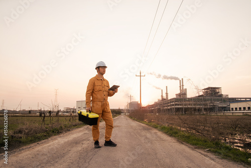 asian male engineer working with digital tablet in oil refinery