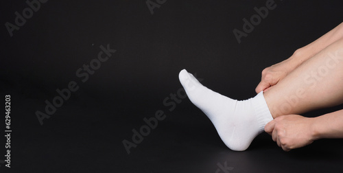 Asian Male legs wear white sock and hand is pulling a sock on black background.