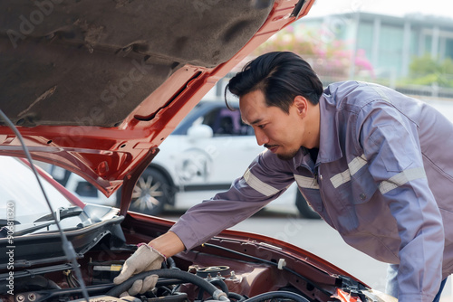 Asian male mechanic in gray uniform inspecting engine under open hood of red car outdoors. Focused on repair work, showing concentration and skill. Represents professionalism, technical expertise,
