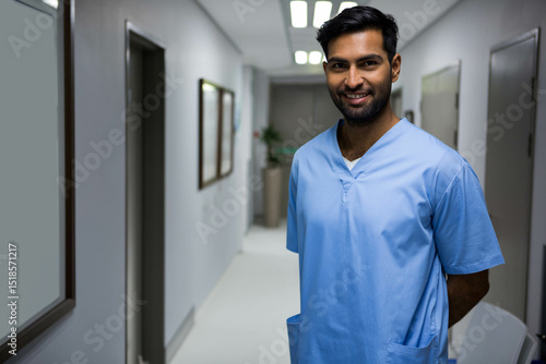 Asian male nurse standing in hospital corridor wearing light blue scrubs by closed doors