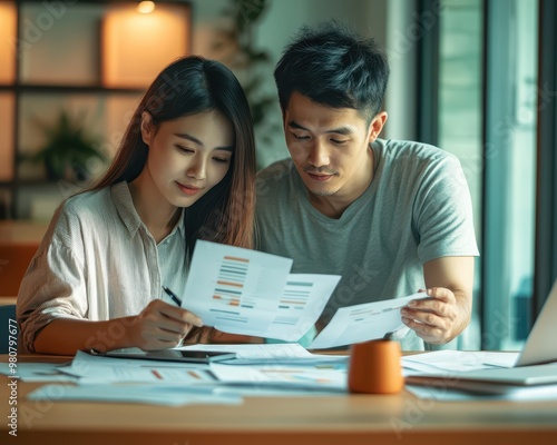 Asian man and woman in a minimalist home office, discussing their financial future with documents and graphs spread out, Future Financial Planning, Couple teamwork