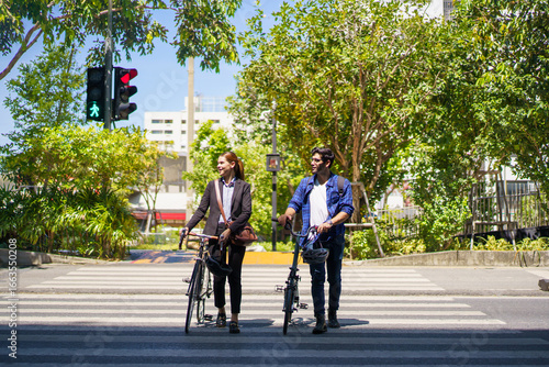 Asian man and woman walking with bicycles in the city on their way to work.