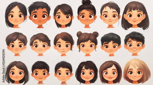 Asian man face construction cartoon set isolated on white background. Vector illustration of different male character eyes, nose, mouth, hairstyle for avatar creation. Game design elements