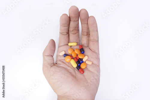 Asian man hand holding many types of pills isolated on white background. hand, human, holding, pills, healthy,