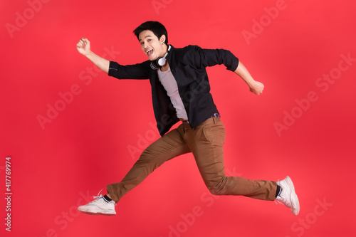 Asian man high jumping in cheerful and excited gesture with headphone on his neck. Studio light shot on red background In the concept of listening to fun music.