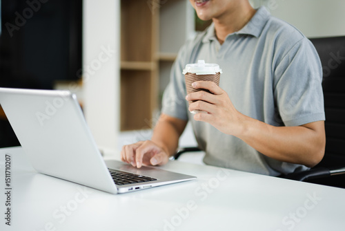 Asian man holding coffee and smartphone, working in modern office with laptop. Perfect for lifestyle