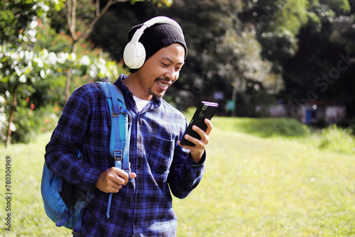 Asian man in a casual outfit, sporting a beanie, plaid shirt, and headphones, checks his phone with a grin, seemingly receiving good news while working remotely on a beautiful morning nature trail