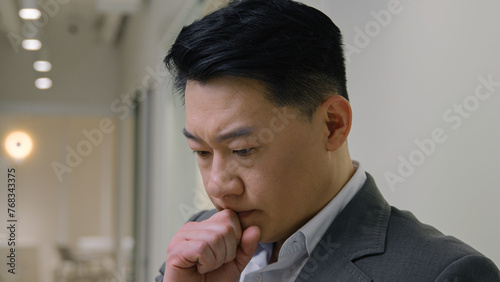 Asian man in corporate office using mobile phone upset thoughtful chinese korean middle-aged businessman texting messages online business social networking receive bad news lost think with smartphone