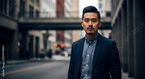 Asian man in suit stands outdoors Buildings street visible in blurred background