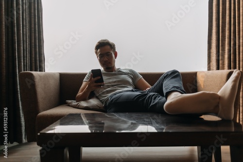 Asian man lies on sofa using phone with his feet on the table. Concept of manner