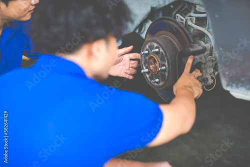 Asian man mechanic changing car wheel at Car maintenance and auto service garage. Young male worker people