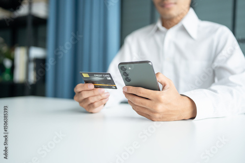 Asian Man paying with credit card on smart phone at office. Male Using Smartphone for Shopping electronic wallet Online