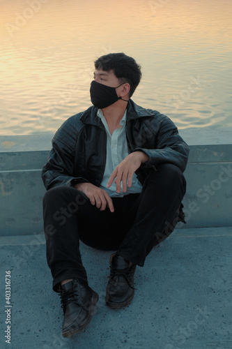 Asian man sit at riverside with black fabric face mask