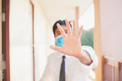 Asian Man surgical mask inspection or man business with covid 19 for stop covid 19 virus covid-19 or corona protected Help protect For social distancing world and people stop virus warning