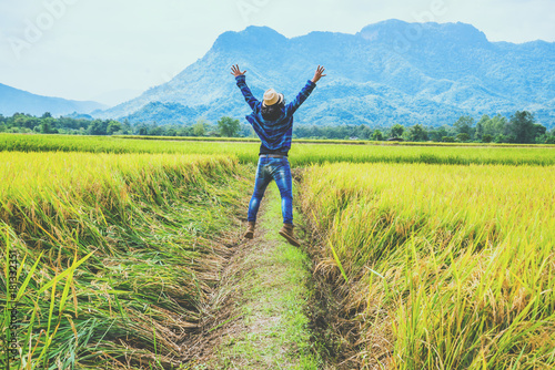 Asian man travel relax in the holiday. Jump natural touch mountain field. Jump stand glad middle field rice. Thailand