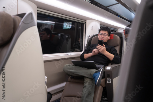 asian man using laptop on train