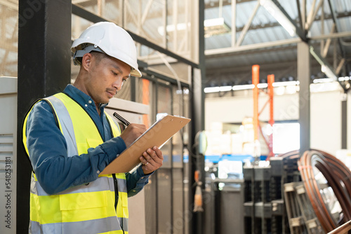 Asian man wearing reflective jacket holding checklist paper standing in factory warehouse.