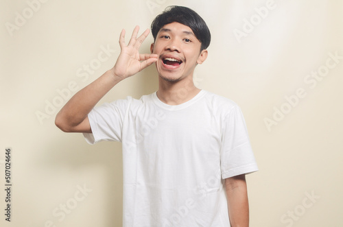 asian man wearing white t-shirt with gesture showing delicious meal on isolated background