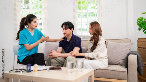 Asian medical professional delivers private home health consultation to adult couple discussing mental emotional wellness support guidance