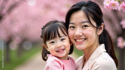 Asian mother and daughter enjoying cherry blossom in springtime park