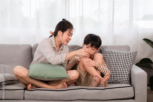 Asian mother treating wound on adorable soninjured knee with tender and care. single mom worried about child keep asking if it hurts, Healthy and medicine concept. Love and care in family.
