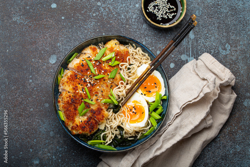 Asian noodles ramen soup with deep fried panko chicken fillet and boiled eggs in ceramic bowl with chop sticks and soy sauce on stone rustic background top view