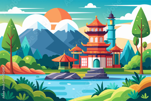 Asian Pagoda Landscape with Mountains, Sunset, and River