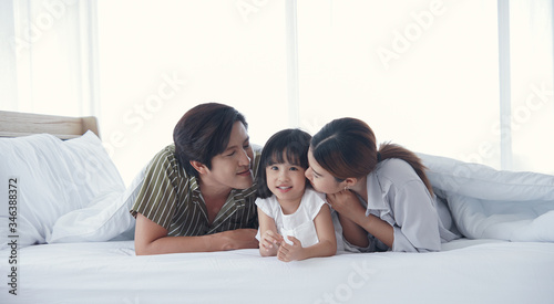 Asian Parents lying on bed under blanket and kissing their little daughter on both cheeks. family portrait
