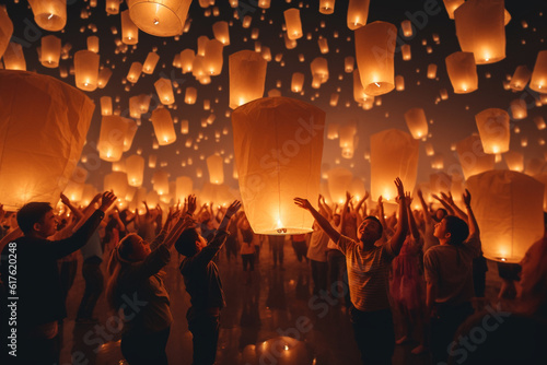 Asian people releasing white paper lanterns into the night sky, creating a breathtaking spectacle at the Sky Lantern Festival. Generative AI.