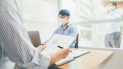 Asian People Successful Teamwork Business Wearing Medical Mask and Working. Work from Private Office Social Distancing among Coronavirus Outbreak Situation